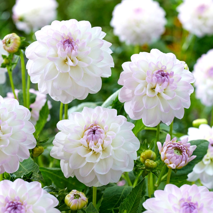 Dalia pomponowa Eveline wyróżnia się biało-kremowymi kwiatami przyprószonymi jasnym fioletem. Kwitnąca od lipca do września roślina, będzie dobrze widoczna w każdym punkcie ogrodu. Bogate, szlachetnie wyglądające kwiaty wyrastają na łodygach, których wysokość jest szacowana na ok. metr. Dalia Eveline to jedna z odmian, po którą warto sięgnąć kiedy chcemy przywrócić nieco świeżości rabatom czy kompozycjom sadzonym na tle parkanów i murów. Jasne pompony o środkach muśniętych delikatnym, pastelowym kolorem fantastycznie uzupełnią zieleń i inne barwy wchodzącego w stan spoczynku ogrodu.