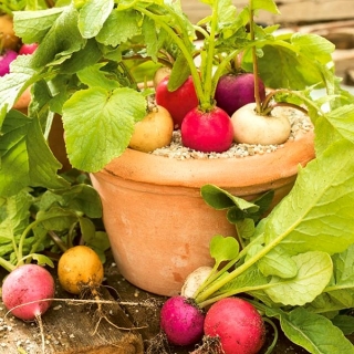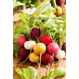 Mieszanka czterech odmian rzodkiewki o kulistych zgrubieniach. W jej skład wchodzą odmiany: karminowa, żółta, biała oraz czerwona z białą końcówką. Są zróżnicowane również pod względem smaku. Idealnie nadają się do tworzenia warzywnych kompozycji oraz wzbogacania wyglądu potraw. Opakowanie...