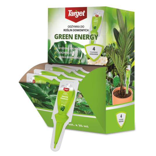 Nawóz do roślin zielonych - Green Energy - w formie wygodnego aplikatora – jest wieloskładnikowym nawozem mineralnym zawierającym mikroelementy. Gotowa do użycia ampułka zawiera innowacyjna postać środka zasilającego rośliny. Jeden aplikator wystarcza na okres 4 tygodni, dostarczając roślinie pełen komplet składników odżywczych. Właściwie zbilansowana receptura nawozu wywiera znakomity wpływ na ogólną kondycję i witalność roślin zielonych. Dodatkowo preparat wzbogacono w unikatowy aktywator metaboliczny, składnik ten odpowiada za szybkie i łatwe przyswajanie składników pokarmowych. Wpływa na wzmocnienie systemu korzeniowego – silny i mocno rozbudowany, lepiej odżywia roślinę.