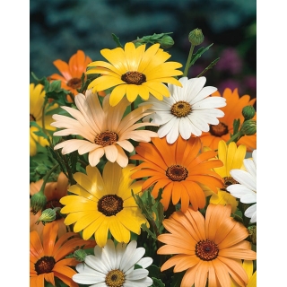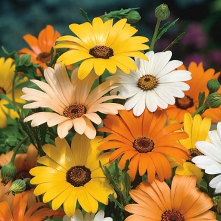 Mieszanka kwiatów gazania.  Gazania to roślina jednoroczna o lekko płożących się łodygach. Kwiaty dwu lub trójbarwne, żółte, pomarańczowe, czerwone lub brązowe. Kwiaty zamykają się w pochmurne dni. Roślina kwitnie od lipca do października. Doskonała na rabaty, obwódki, do ogródków skalnych....