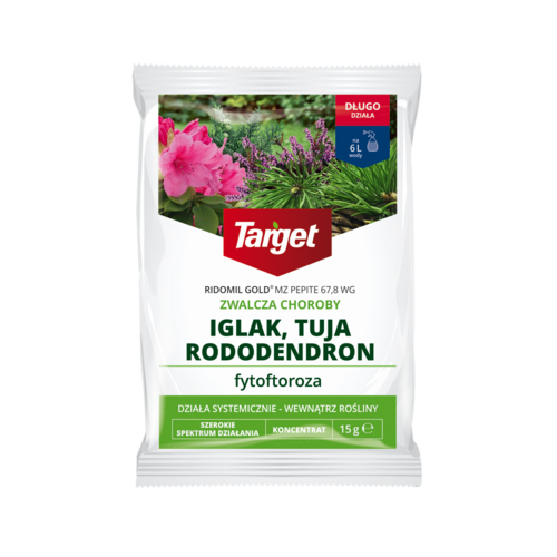 Ridomil Gold MZ Pepite 67,8 WG – zwalcza fytoftorozę – Target – 15 g to najlepszy środek do stosowania profilaktycznego w uprawie roślin sadowniczych, warzywnych, przemysłowych i ozdobnych, podatnych na fytoftorozę. Prezentowany preparat cechuje się stuprocentową skutecznością w zapobieganiu tej groźnej chorobie grzybowej, która poraża i wyniszcza różne gatunki roślin użytkowych oraz dekoracyjnych. Poleca się go w szczególności do kompleksowej pielęgnacji drzewek i krzewów iglastych, rododendronów, roślin doniczkowych, wszystkich ziół, tytoniu, winorośli, a także warzyw uprawianych w gruncie i pod osłonami, w tym pomidora, ogórka, cebuli, sałaty, kalafiora, brokułu i ziemniaka. Ridomil Gold MZ Pepite 67,8 WG skutecznie zabezpiecza młode, intensywnie rosnące okazy, najbardziej wrażliwe na choroby grzybowe. Działa kontaktowo i układowo, dzięki czemu chroni rośliny przed patogenami przez okres nawet 14 dni. Poleca się go w profilaktyce nie tylko fytoftorozy, ale również przeciwko zarazie ziemniaka, alternariozie, mączniakowi rzekomemu i bielikowi krzyżowych.