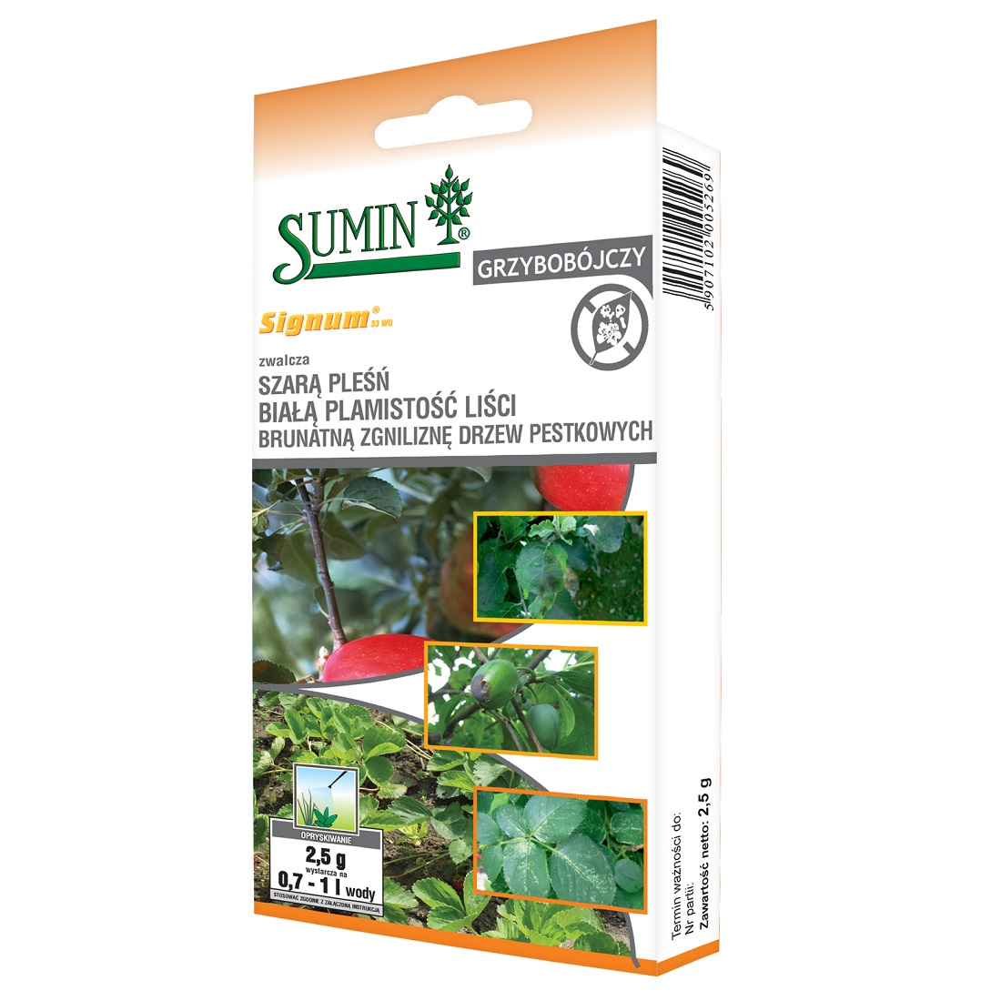 Opakowanie zawiera 2,5 g preparatu Signum 33 WG – na szarą pleśń, białą plamistość liści, brunatną zgniliznę drzew pestkowych. Produkt firmy Sumin.