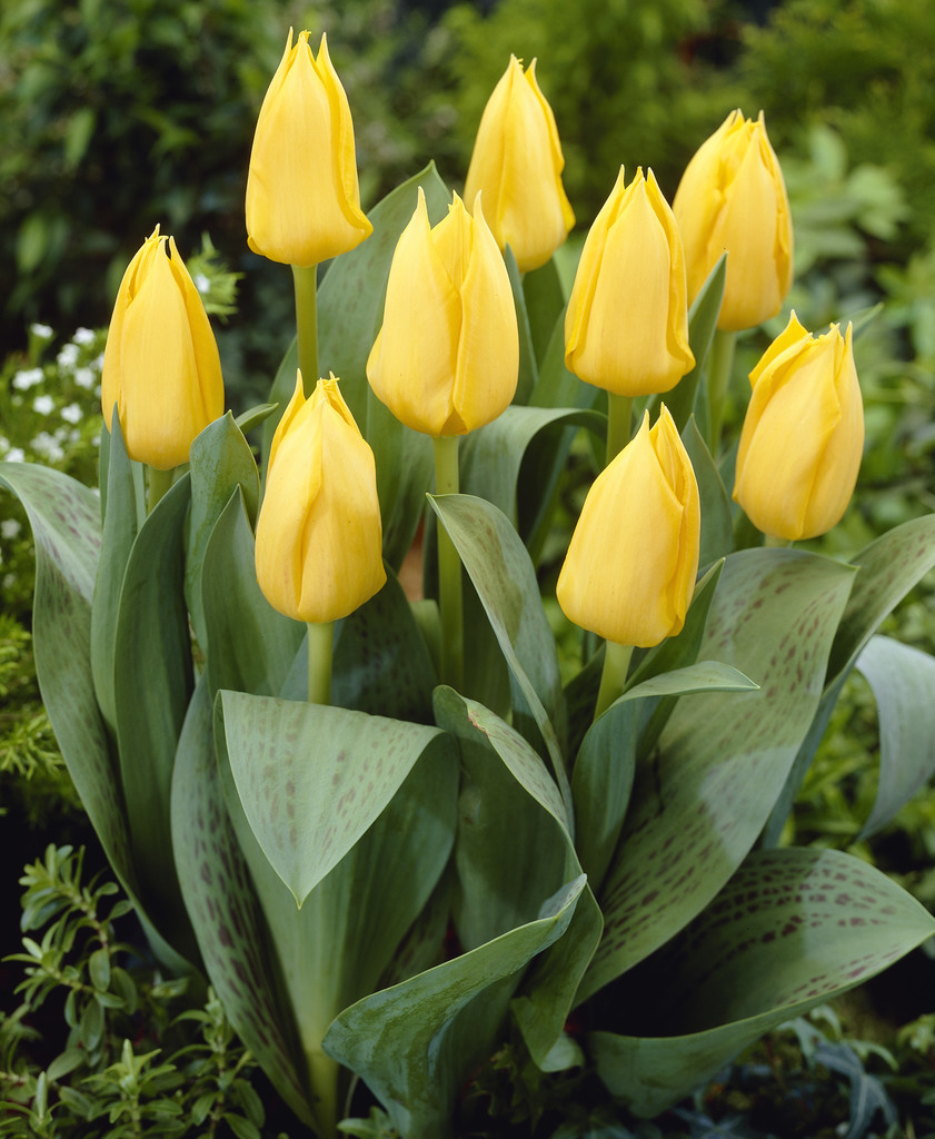 Tulipan niski żółty - Greigii Yellow wywodzi się z dziko rosnących tulipanów w Turkiestanie. Cechą charakterystyczna tej grupy są piękne szerokie wzorzyste liście, które zdobią rośliny nawet przed kwitnieniem. Powierzchnia liścia może być zdobiona przez paski, smugi, cętki. Niebywałą zaletą grupy Greiga jest wielkość kwiatu, w stosunku do całej rośliny. Bardzo duże, jajowate główki wyglądają bardzo efektownie. Ze względu na rozmiary, polecany jest na obwódki, do ogródków skalnych, na brzegi rabat mieszanych. Można nimi obsadzać powierzchnię w pobliżu krzewów. Bardzo ładnie prezentują się w ozdobnych pojemnikach. Mogą być nieszablonową dekoracją balkonów i tarasów. Zakwitają w połowie wiosny, na przełomie kwietnia i maja.